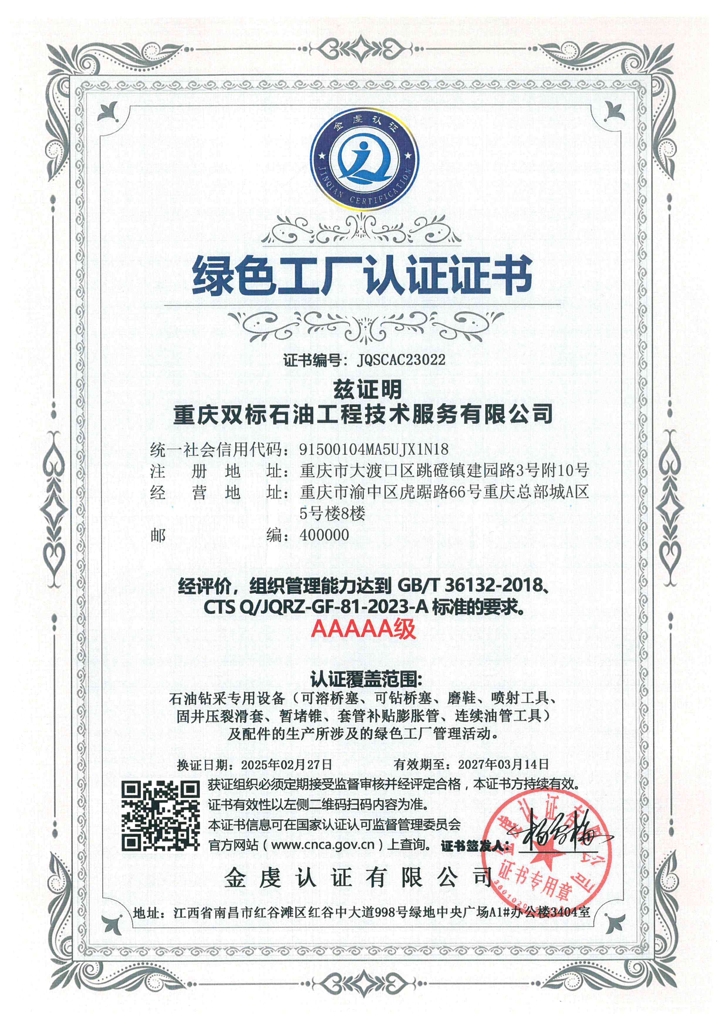 2024年1月,双标石油生产及注册地址迁址重庆市大渡口区跳磴镇建园路3号附10号(建桥先进制造产业园7-1厂房)